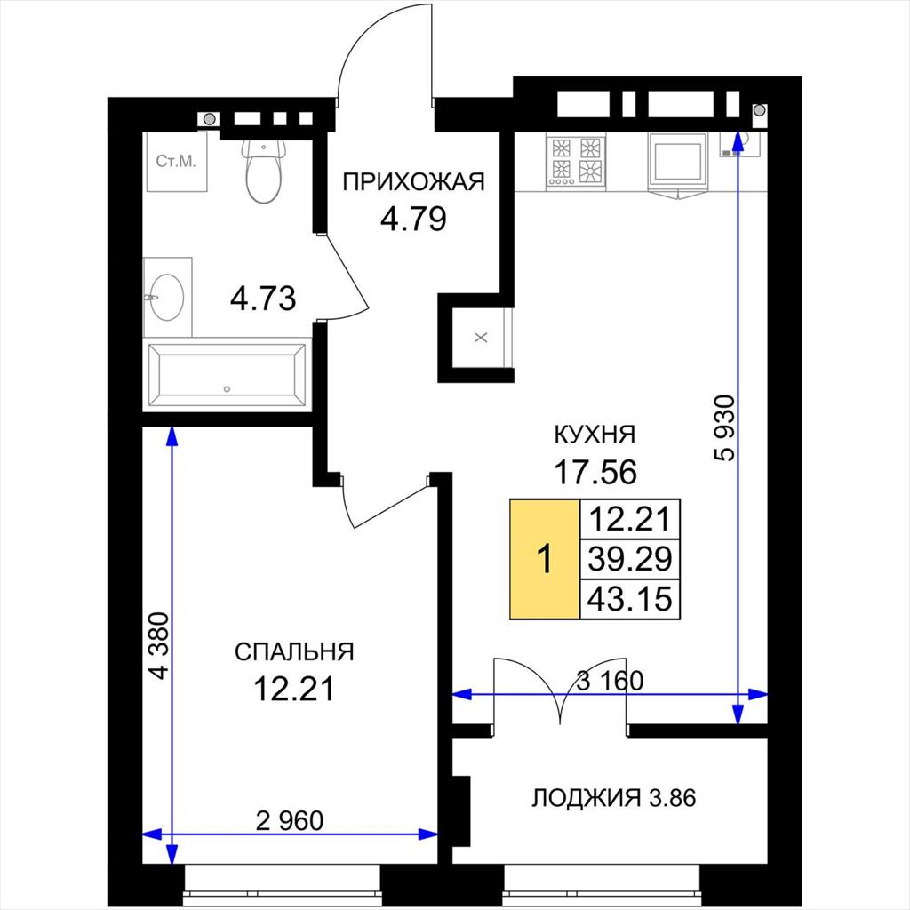 общая 43,15 м2, жилая 12,21 м2, кухни 17,56 м2 |