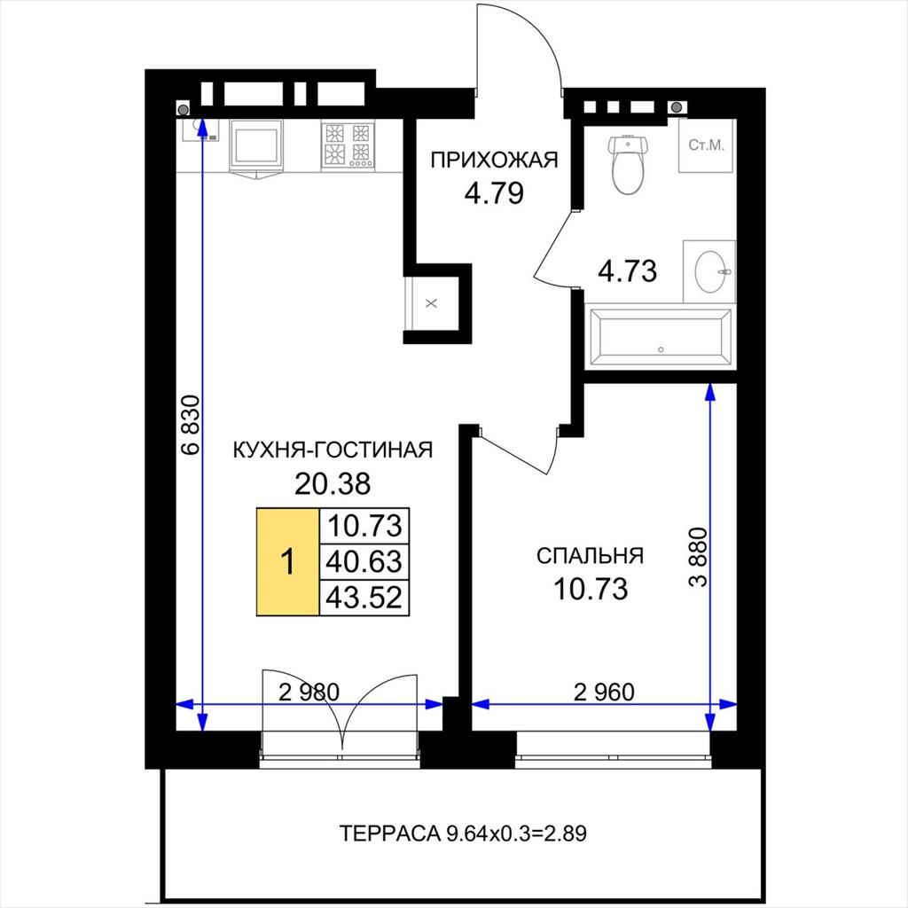 общая 43,52 м2, жилая 10,73 м2, кухни 20,38 м2 |