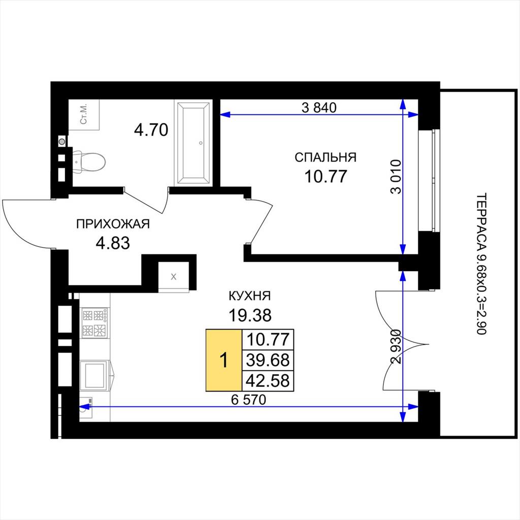общая 42,58 м2, жилая 10,77 м2, кухни 19,38 м2 |