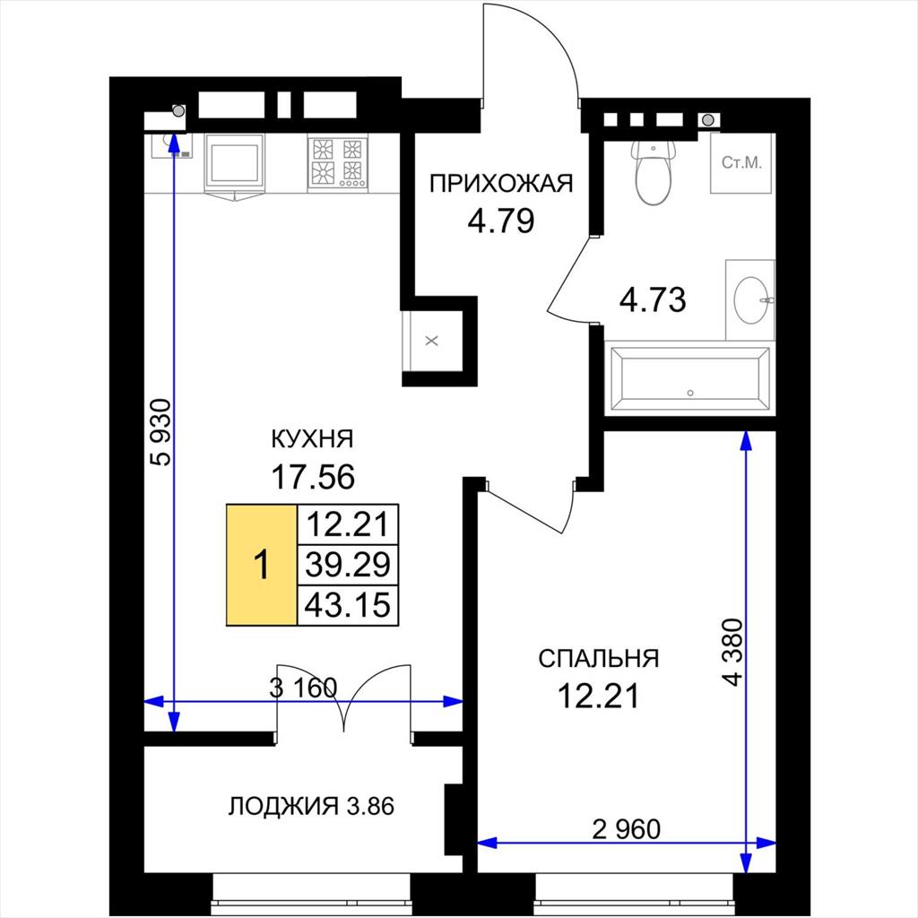 общая 43,15 м2, жилая 12,21 м2, кухни 17,56 м2 |