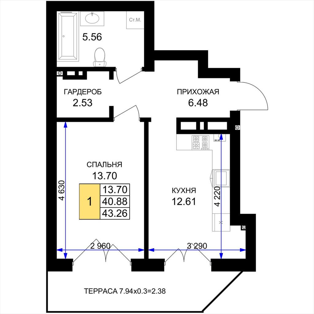 общая 43,26 м2, жилая 13,7 м2, кухни 12,61 м2 |