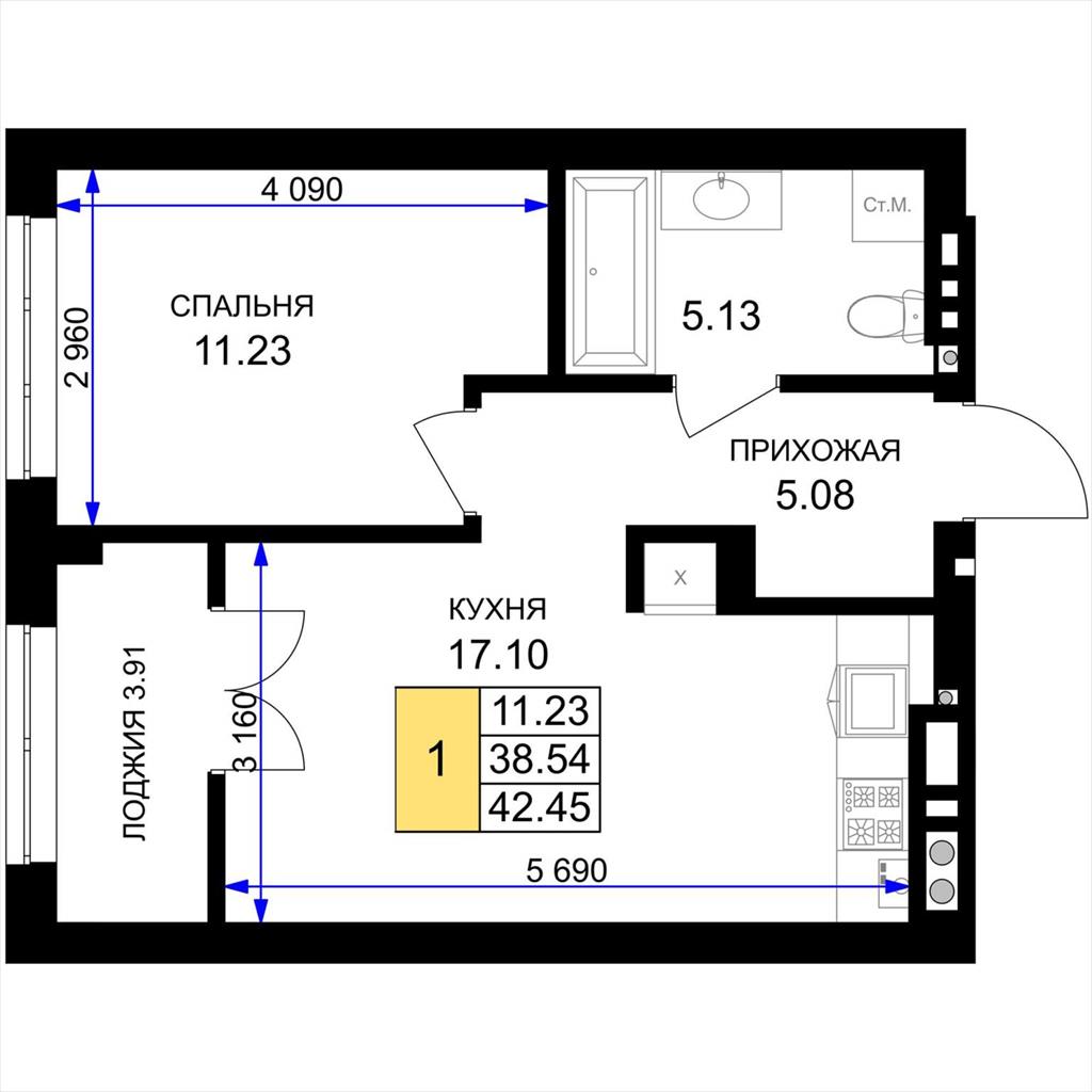 общая 42,45 м2, жилая 11,23 м2, кухни 17,1 м2 |