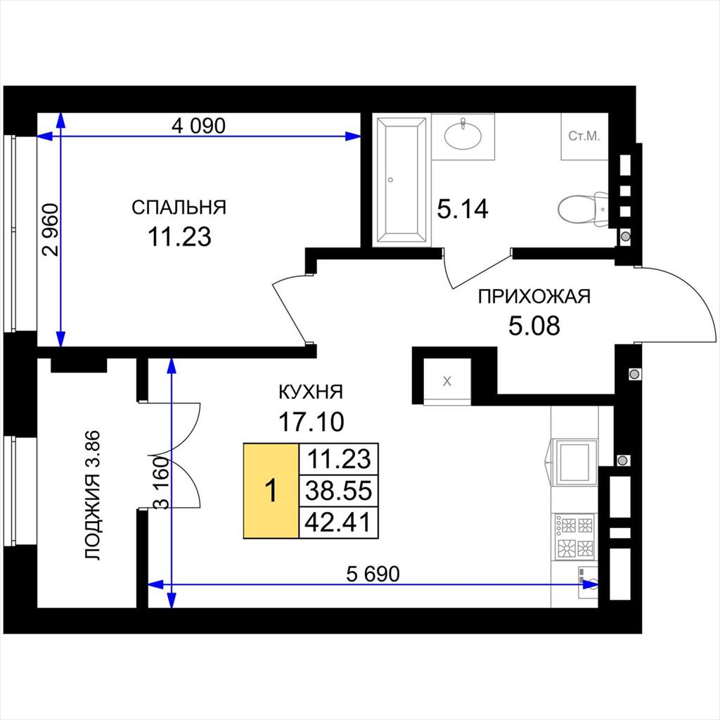 общая 42,41 м2, жилая 11,23 м2, кухни 17,1 м2 |