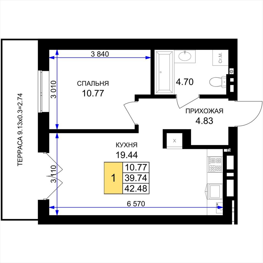 общая 42,48 м2, жилая 10,77 м2, кухни 19,44 м2 |