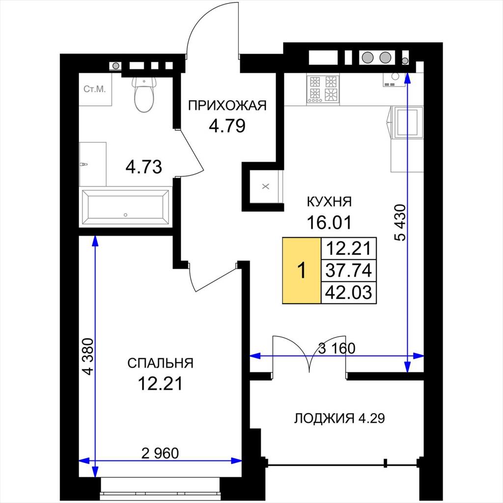 общая 42,03 м2, жилая 12,21 м2, кухни 16,01 м2 |