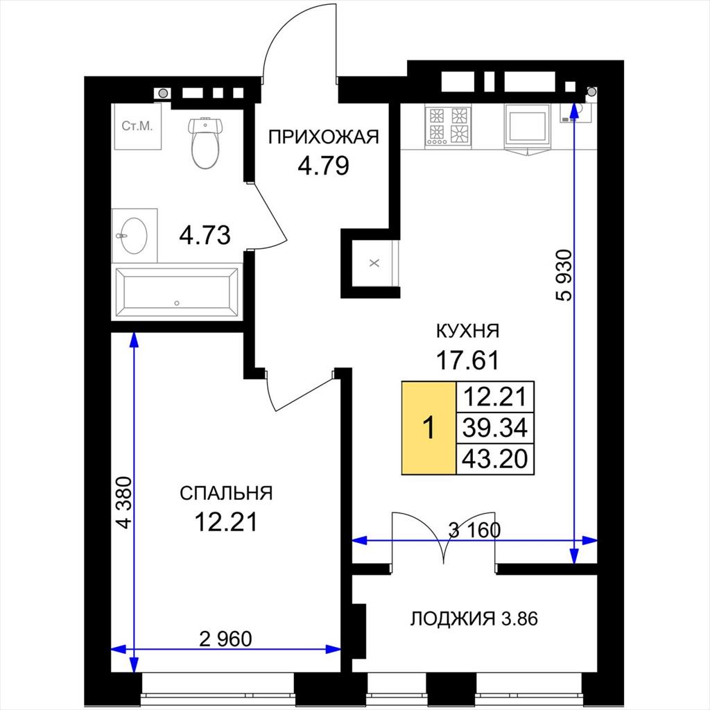 общая 43,2 м2, жилая 12,21 м2, кухни 17,61 м2 |
