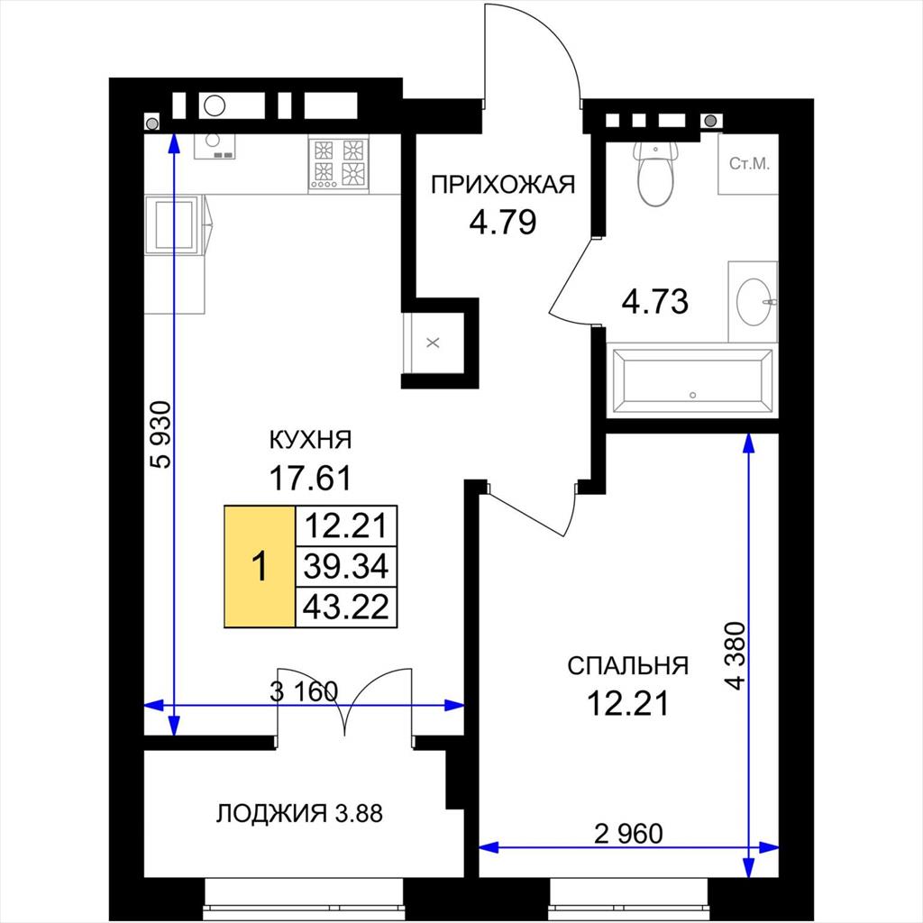 общая 43,22 м2, жилая 12,21 м2, кухни 17,61 м2 |