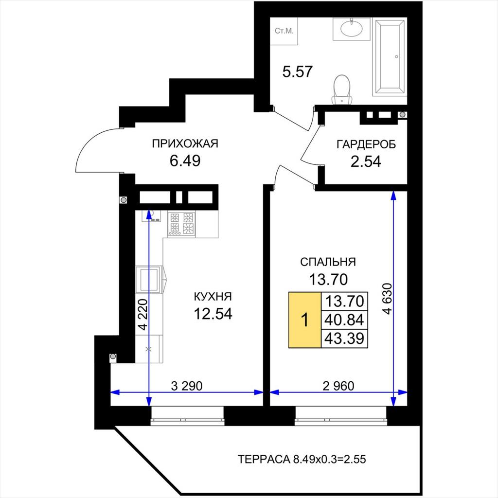 общая 43,39 м2, жилая 13,7 м2, кухни 12,54 м2 |