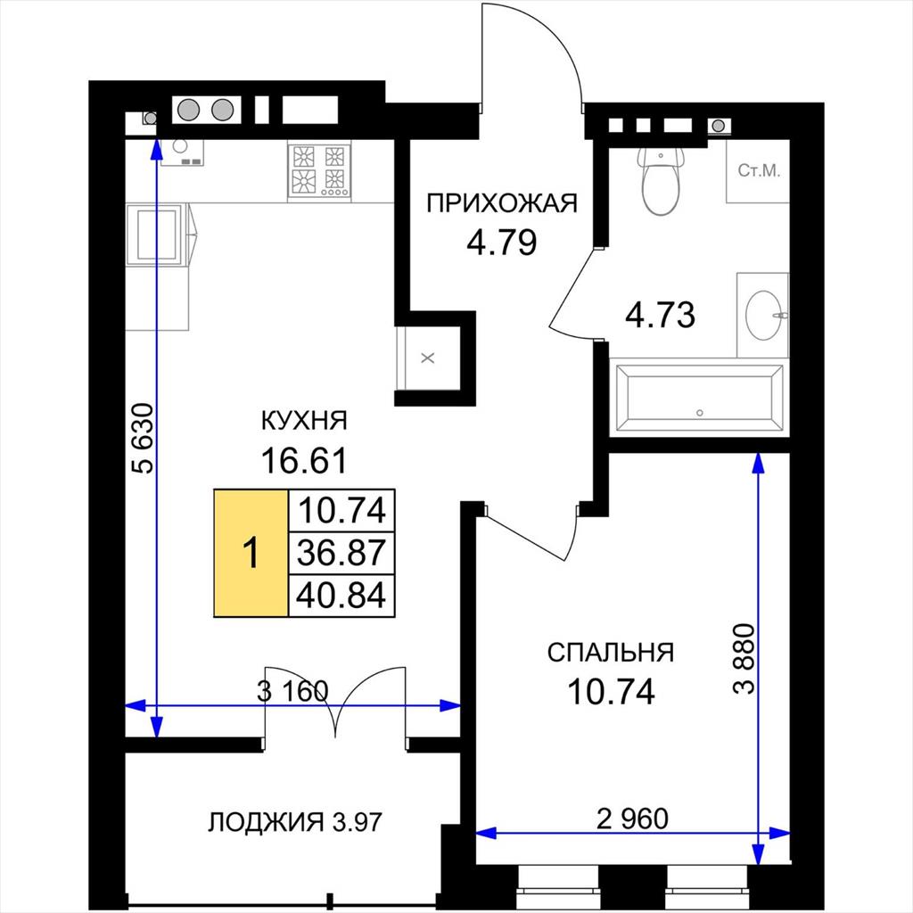 общая 40,84 м2, жилая 10,74 м2, кухни 16,61 м2 |