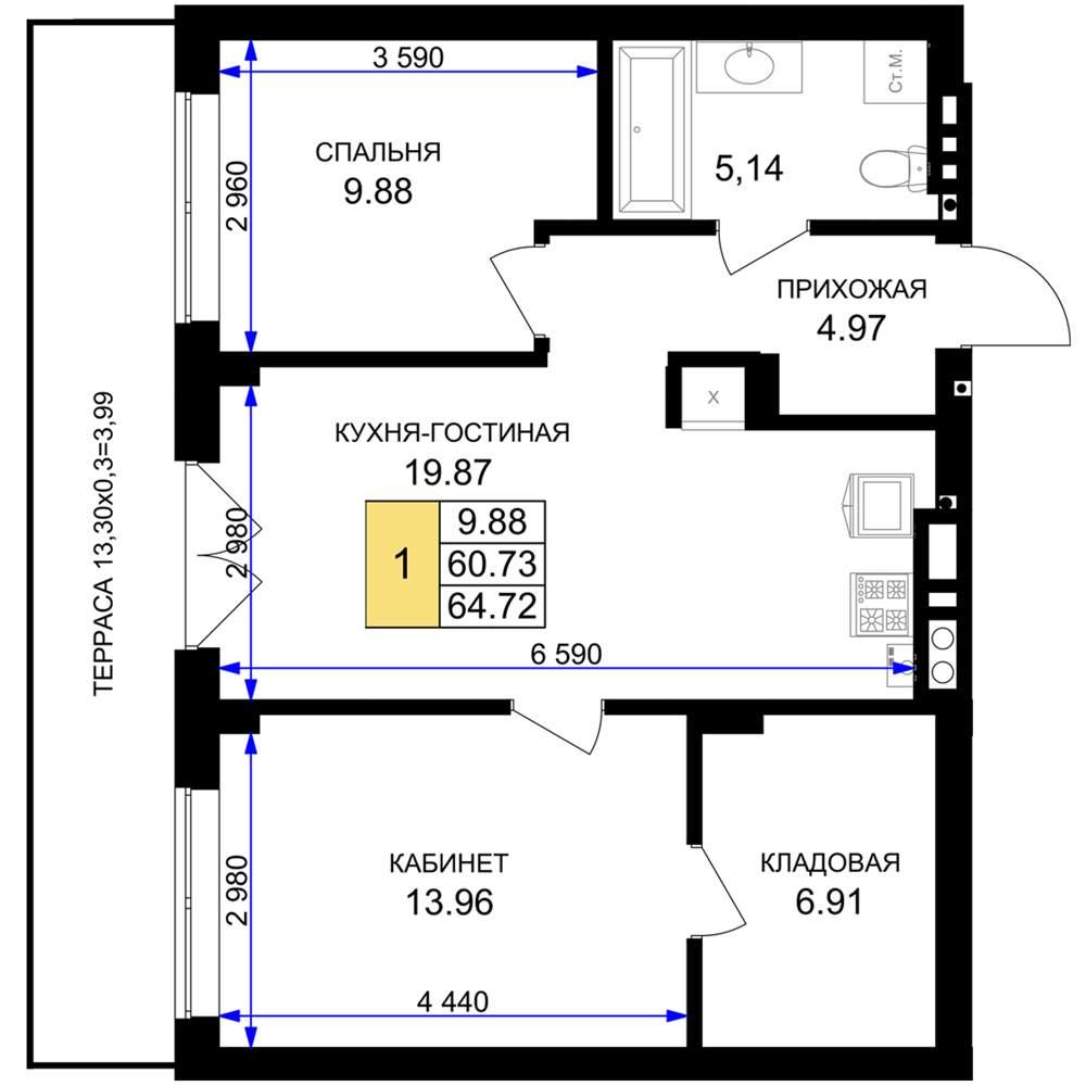 общая 64,72 м2, жилая 9,88 м2, кухни 19,87 м2 |