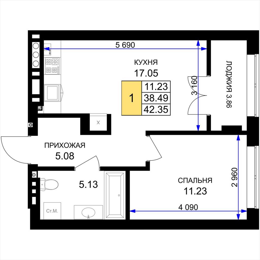 общая 42,35 м2, жилая 11,23 м2, кухни 17,05 м2 |