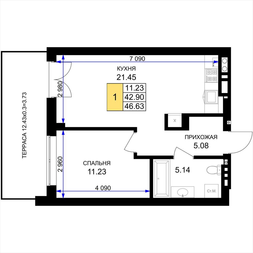 общая 46,63 м2, жилая 11,23 м2, кухни 21,45 м2 |