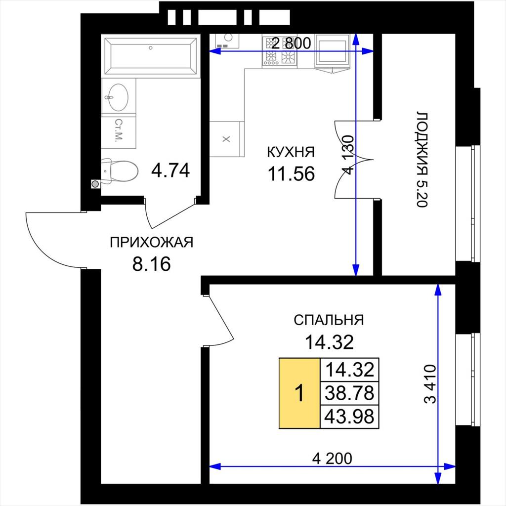 общая 43,98 м2, жилая 14,32 м2, кухни 11,56 м2 |