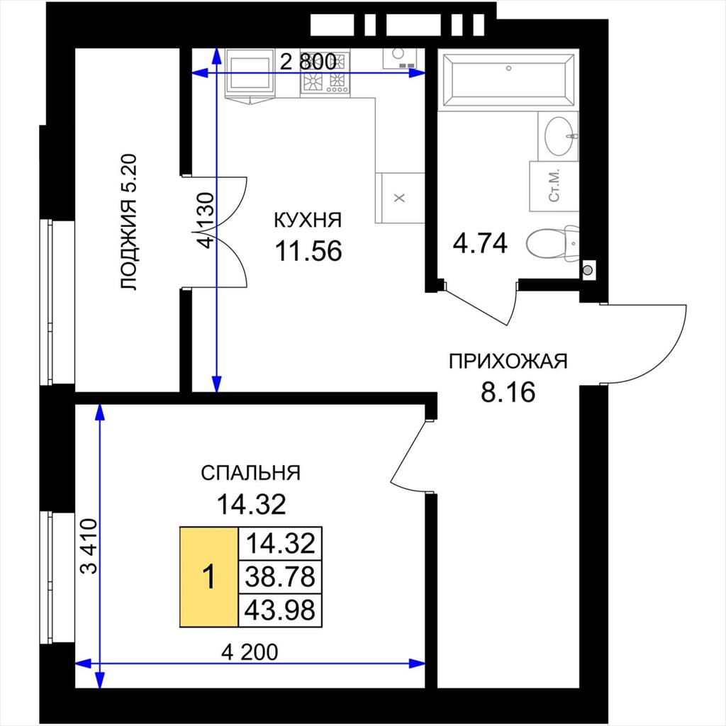 общая 43,98 м2, жилая 14,32 м2, кухни 11,56 м2 |