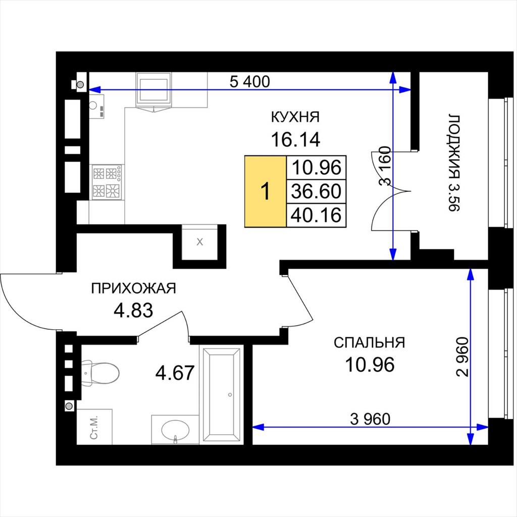 общая 40,16 м2, жилая 10,96 м2, кухни 16,14 м2 |