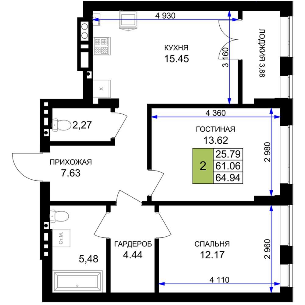 общая 64,94 м2, жилая 25,79 м2, кухни 15,45 м2 |