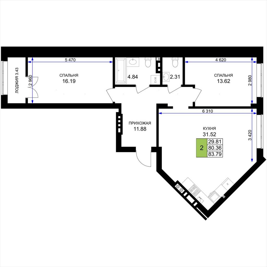 общая 83,79 м2, жилая 29,81 м2, кухни 31,52 м2 |