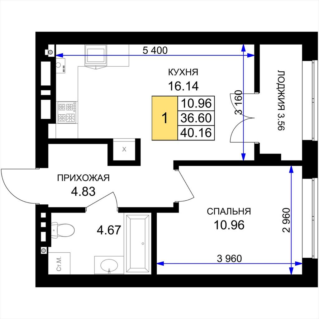 общая 40,16 м2, жилая 10,96 м2, кухни 16,14 м2 |