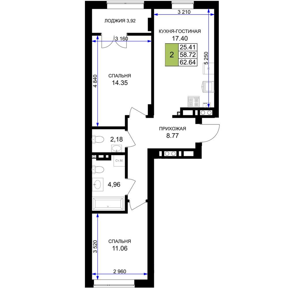 общая 62,64 м2, жилая 25,41 м2, кухни 17,4 м2 |