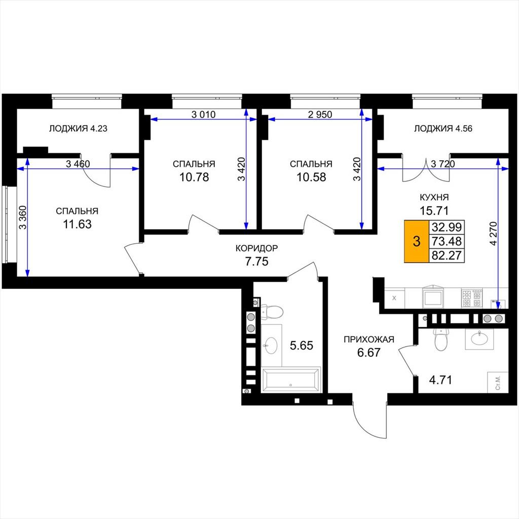 общая 82,27 м2, жилая 32,99 м2, кухни 15,71 м2 |
