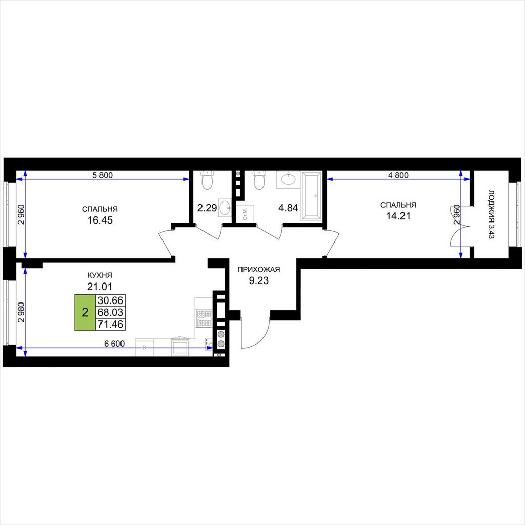 общая 71,46 м2, жилая 30,66 м2, кухни 21,01 м2 |