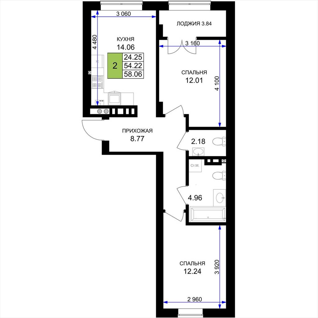 общая 58,06 м2, жилая 24,25 м2, кухни 14,06 м2 |