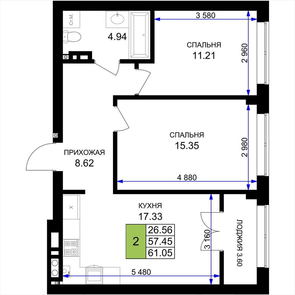 общая 61,05 м2, жилая 26,56 м2, кухни 17,33 м2 |