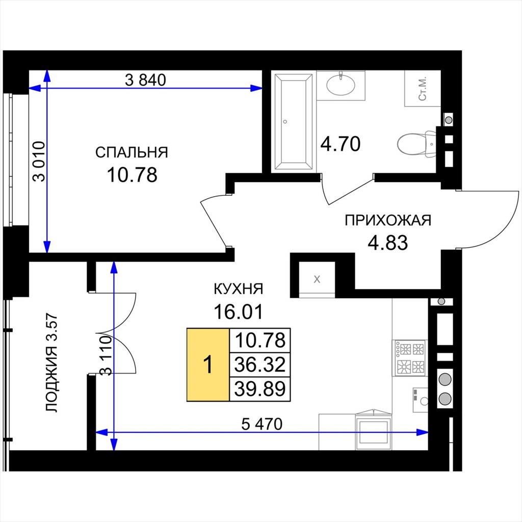 общая 39,89 м2, жилая 10,78 м2, кухни 16,01 м2 |