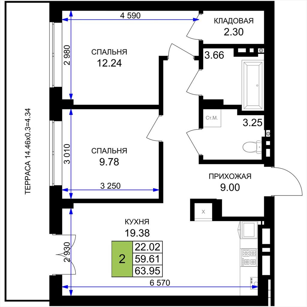 общая 63,95 м2, жилая 22,02 м2, кухни 19,38 м2 |