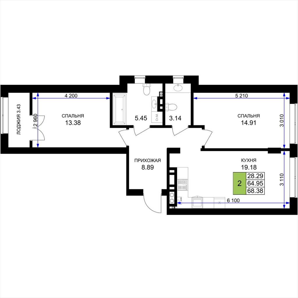 общая 68,38 м2, жилая 28,29 м2, кухни 19,18 м2 |