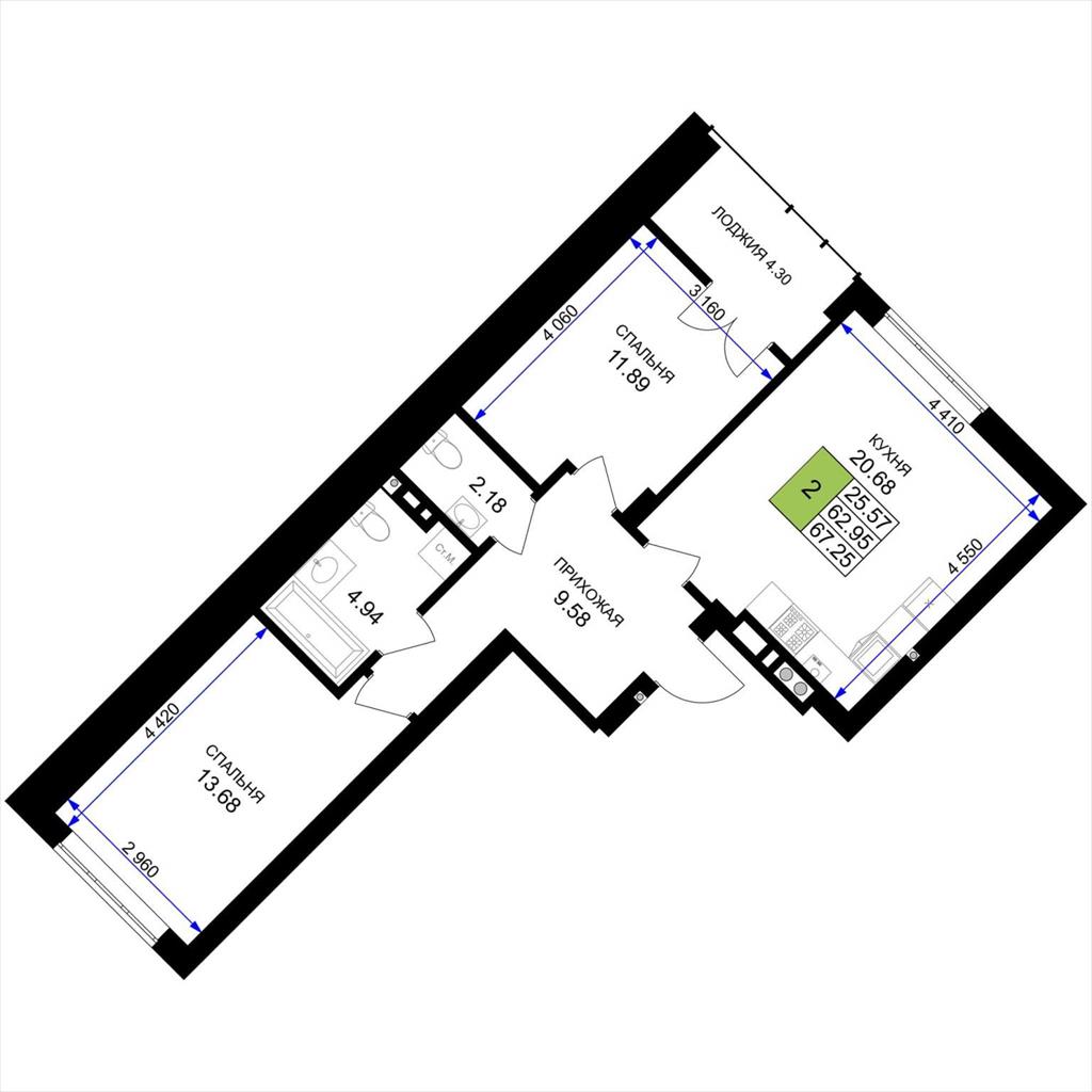 общая 67,25 м2, жилая 25,57 м2, кухни 20,68 м2 |