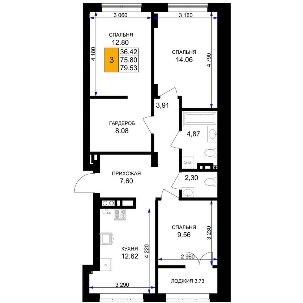 общая 79,53 м2, жилая 36,42 м2, кухни 12,62 м2 |