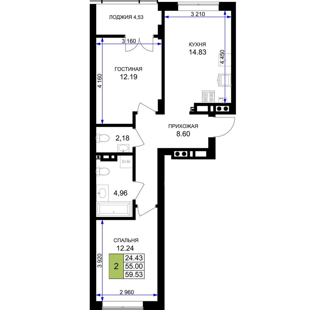 общая 59,53 м2, жилая 24,43 м2, кухни 14,83 м2 |