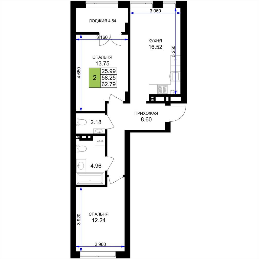 общая 62,79 м2, жилая 25,99 м2, кухни 16,52 м2 |