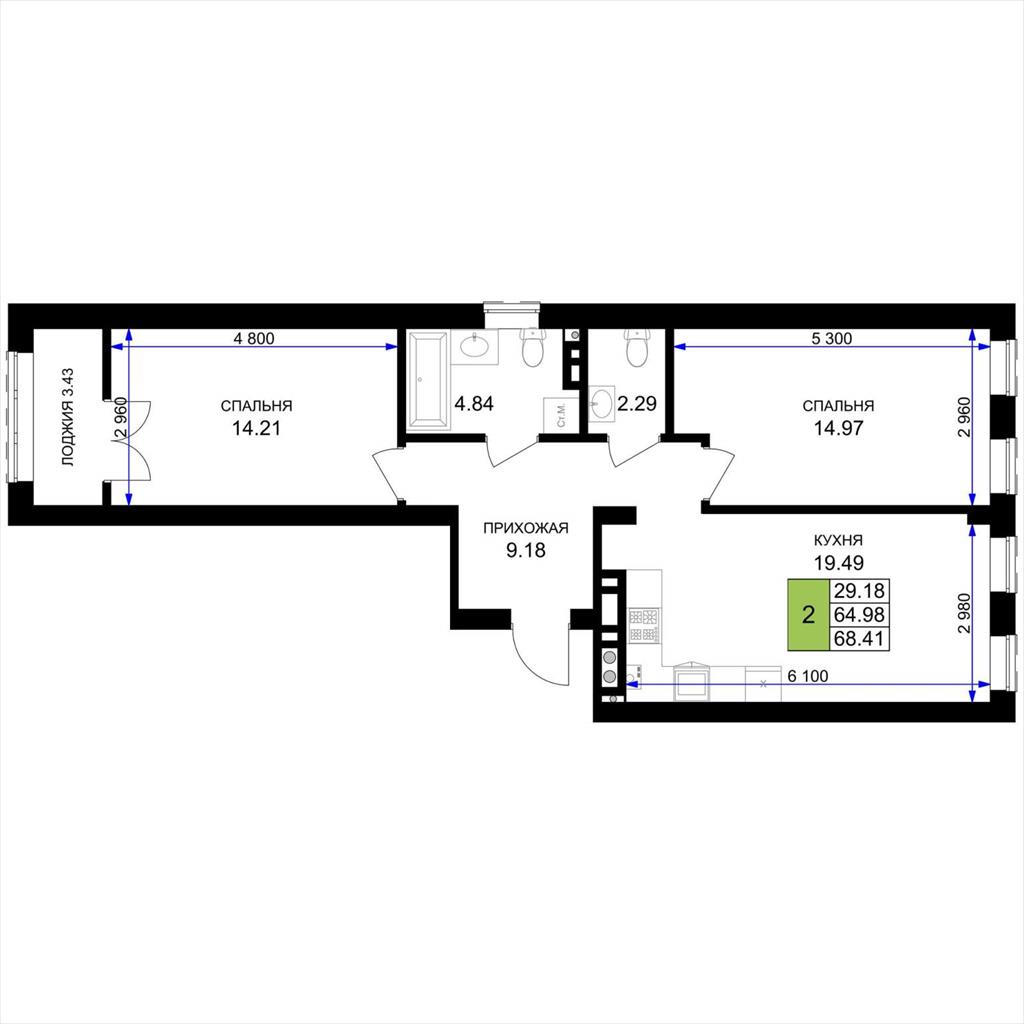 общая 68,41 м2, жилая 29,18 м2, кухни 19,49 м2 |