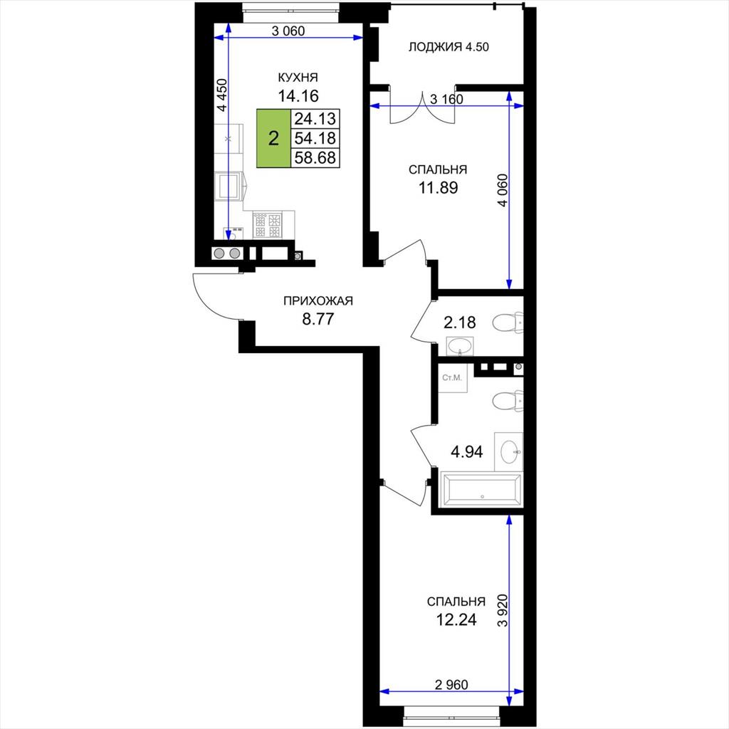 общая 58,68 м2, жилая 24,13 м2, кухни 14,16 м2 |