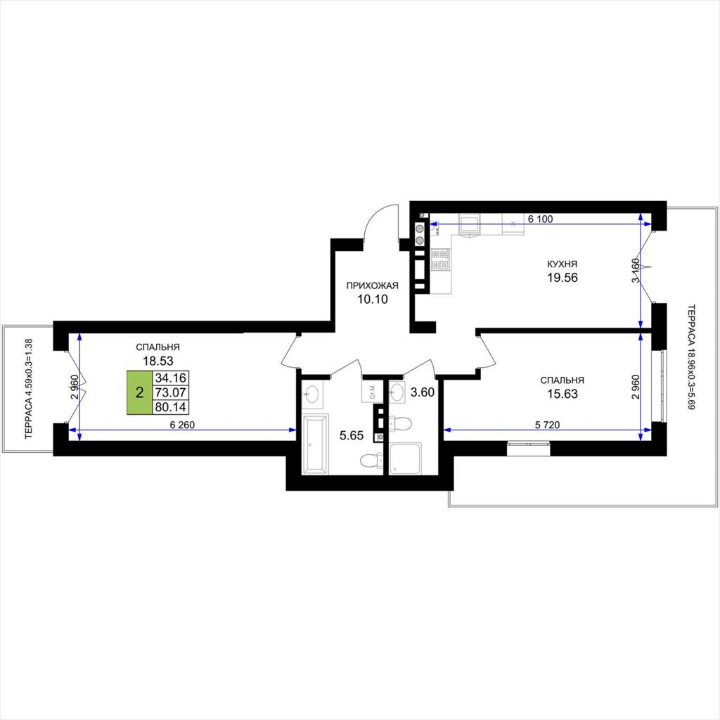 общая 80,14 м2, жилая 34,16 м2, кухни 19,56 м2 |