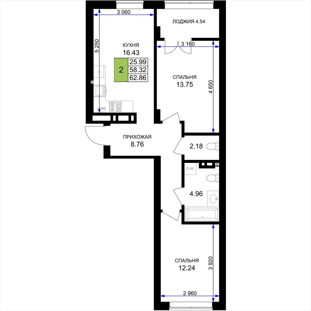 общая 62,86 м2, жилая 25,99 м2, кухни 16,43 м2 |