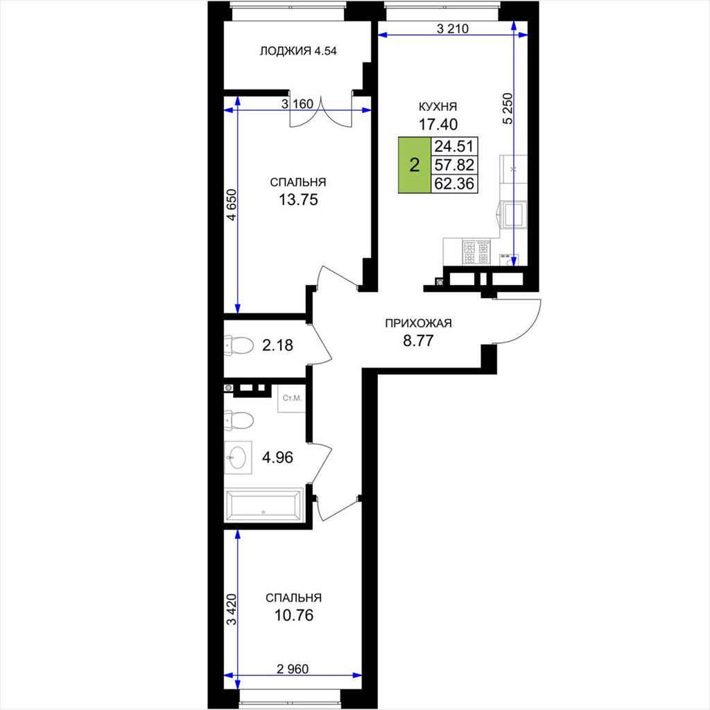 общая 62,36 м2, жилая 24,51 м2, кухни 17,4 м2 |
