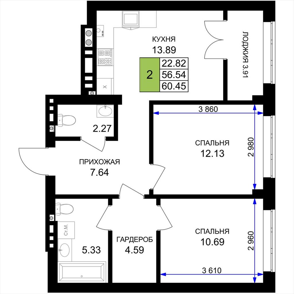 общая 60,45 м2, жилая 22,82 м2, кухни 13,89 м2 |