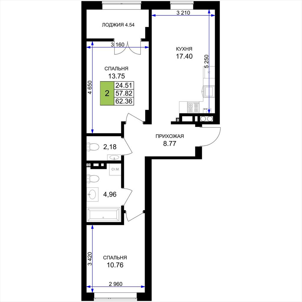 общая 62,36 м2, жилая 24,51 м2, кухни 17,4 м2 |