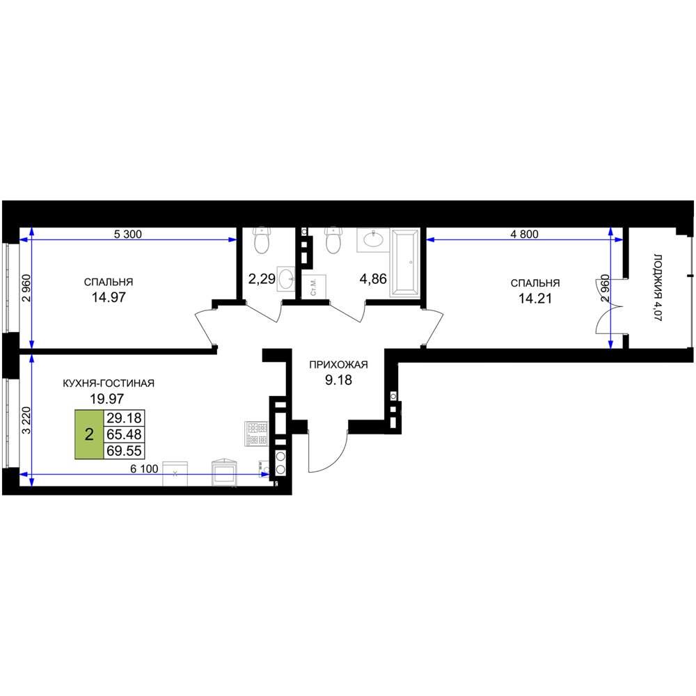 общая 69,55 м2, жилая 29,18 м2, кухни 19,97 м2 |