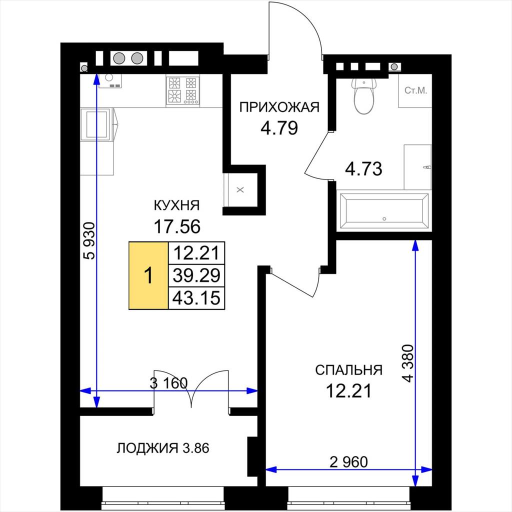 общая 43,15 м2, жилая 12,21 м2, кухни 17,56 м2 |