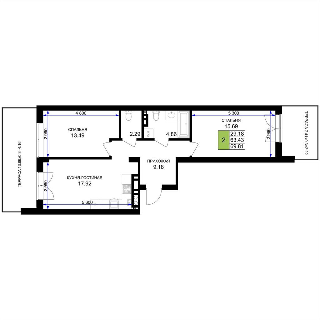 общая 69,81 м2, жилая 29,18 м2, кухни 17,92 м2 |