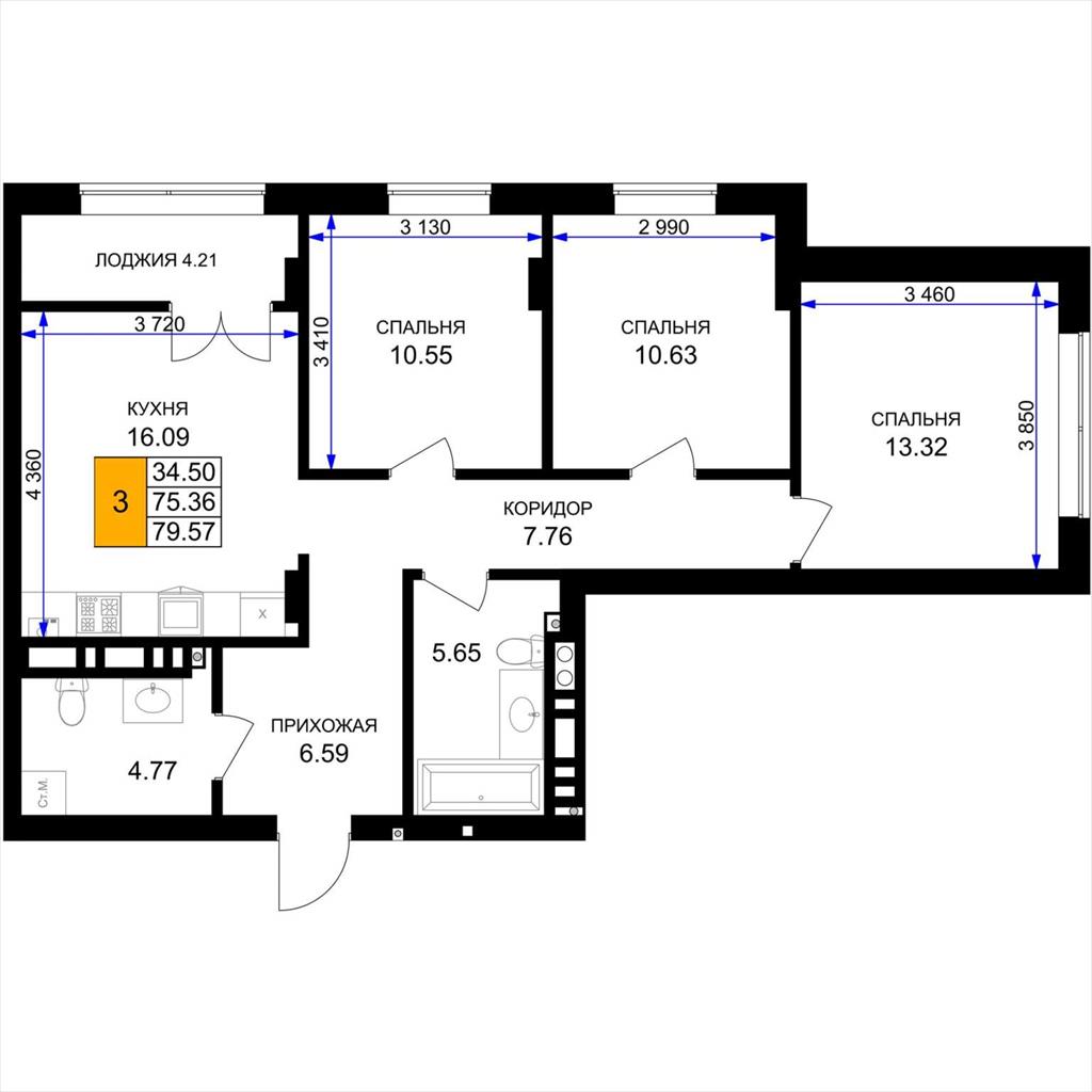 общая 79,57 м2, жилая 34,5 м2, кухни 16,09 м2 |