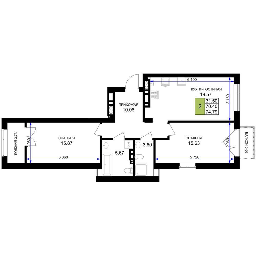 общая 74,79 м2, жилая 31,5 м2, кухни 19,57 м2 |