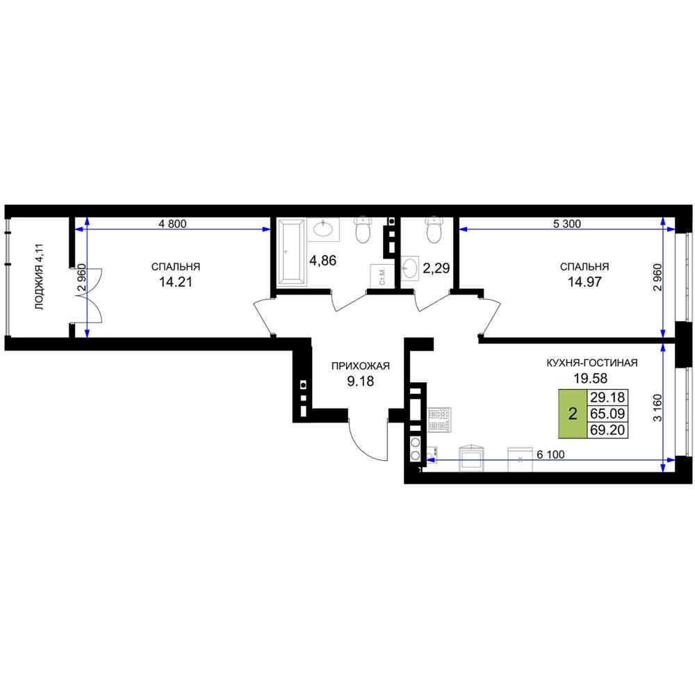 общая 69,2 м2, жилая 29,18 м2, кухни 19,58 м2 |