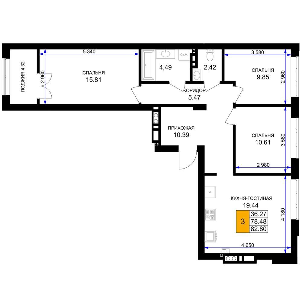 общая 82,8 м2, жилая 36,27 м2, кухни 19,44 м2 |