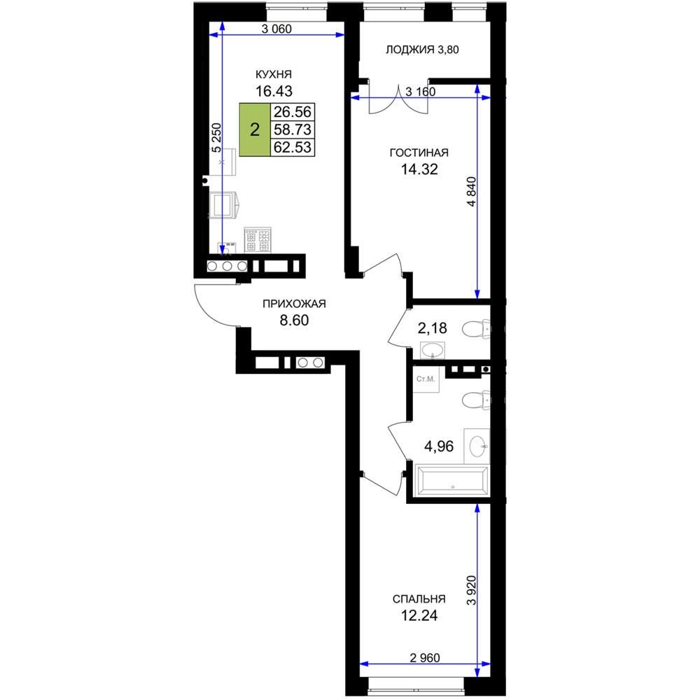 общая 62,53 м2, жилая 26,56 м2, кухни 16,43 м2 |