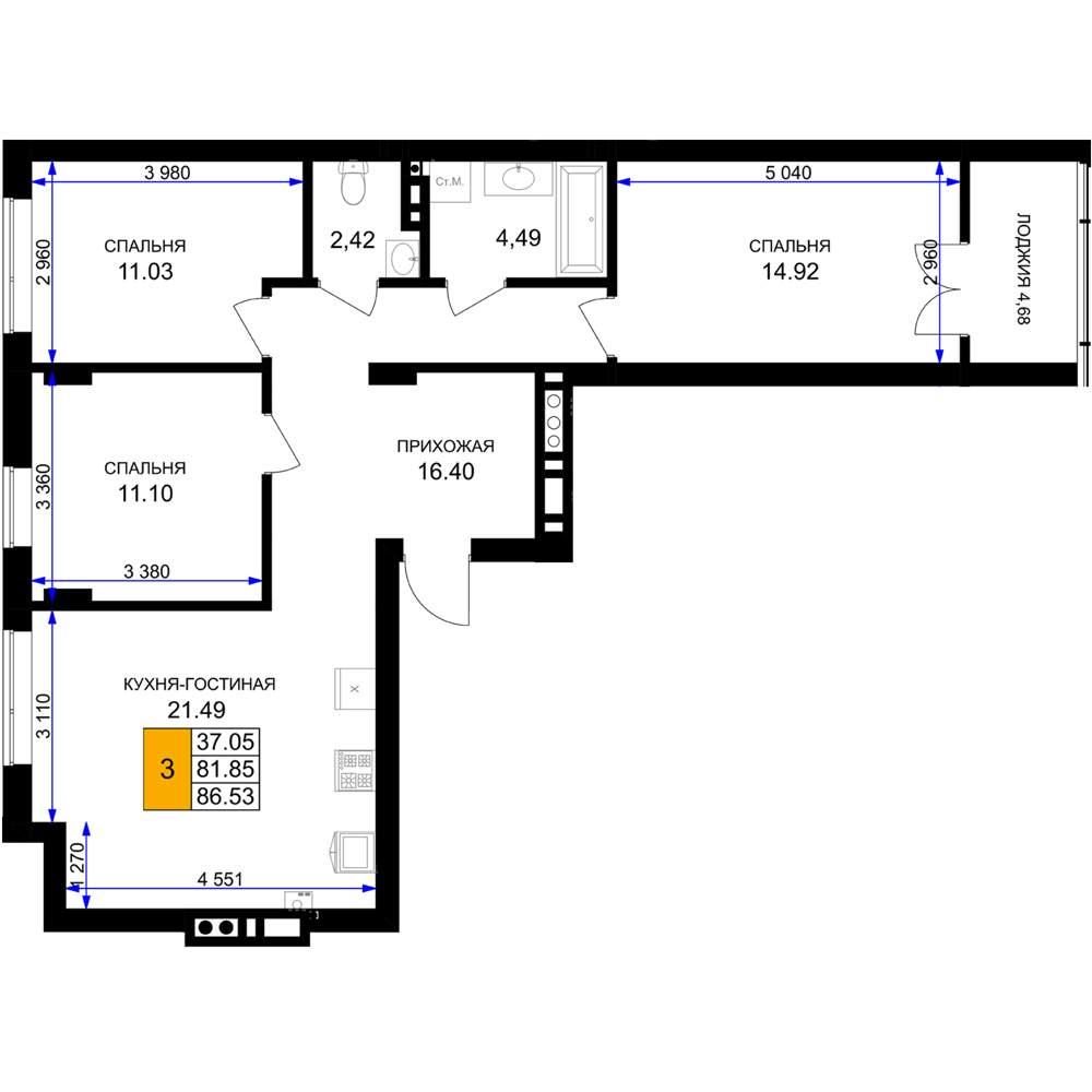 общая 86,53 м2, жилая 37,05 м2, кухни 21,49 м2 |